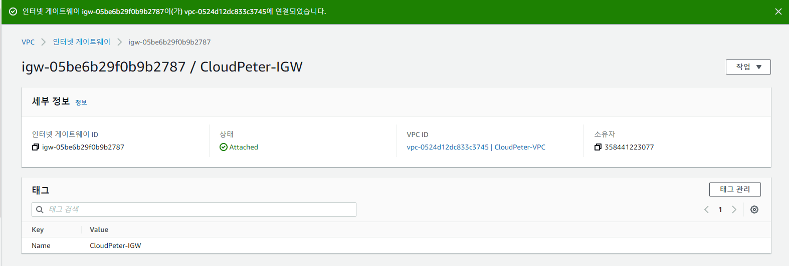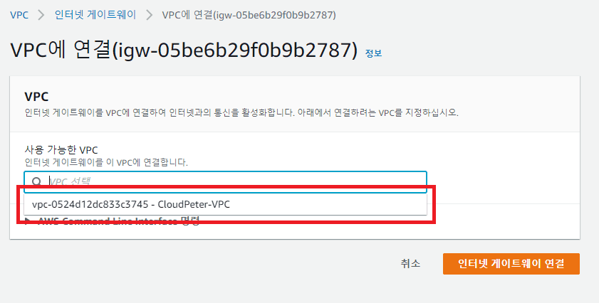 3. IGW와 VPC 연결 사용 가능한 VPC: 생성한 VPC 선택 (CloudPeter-VPC)