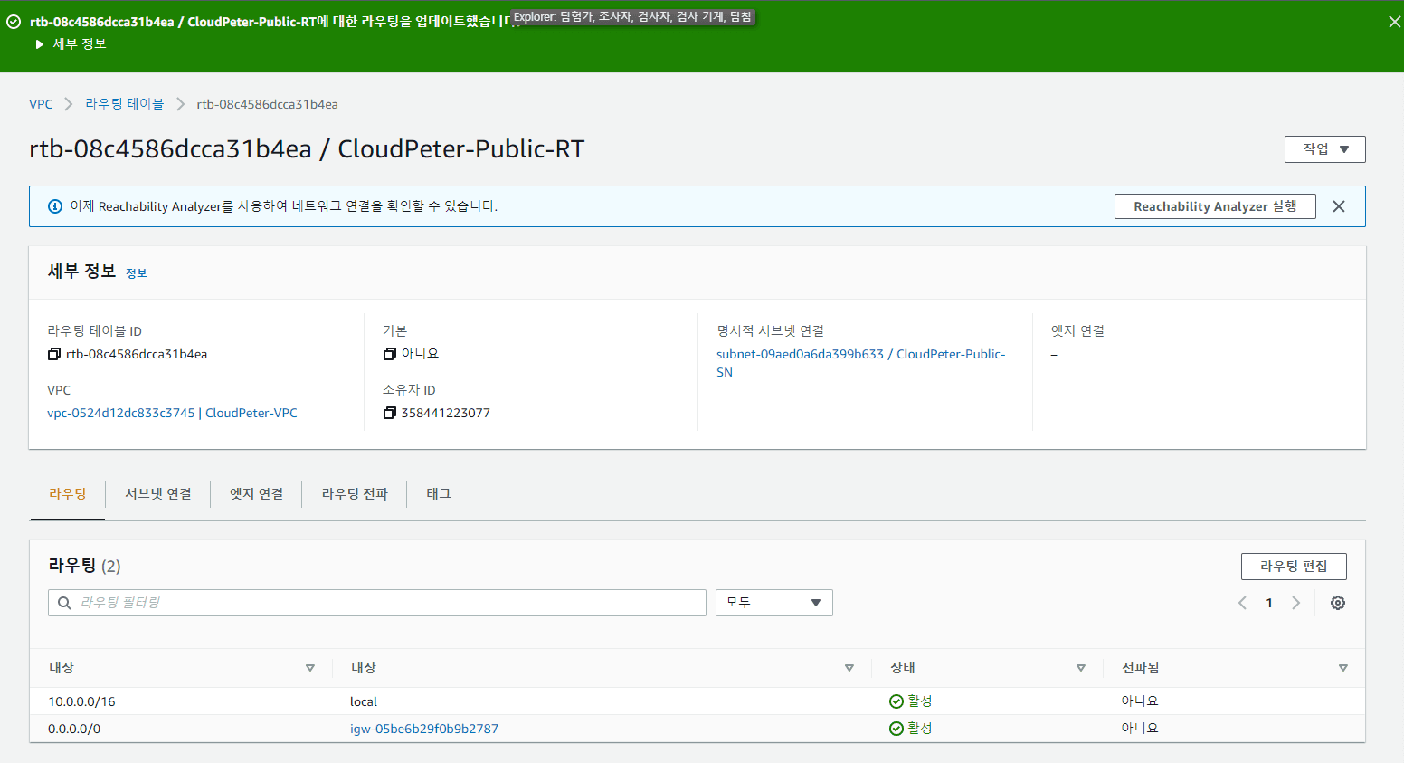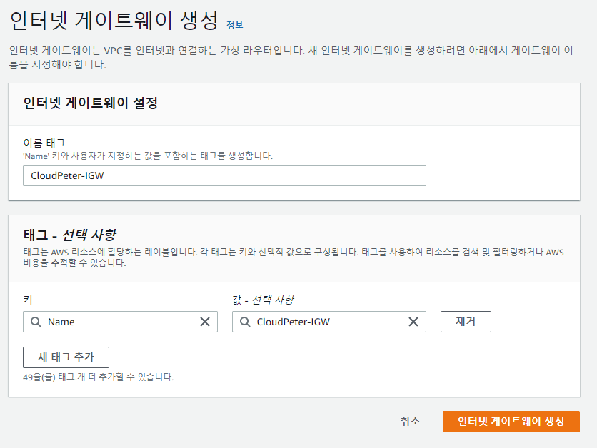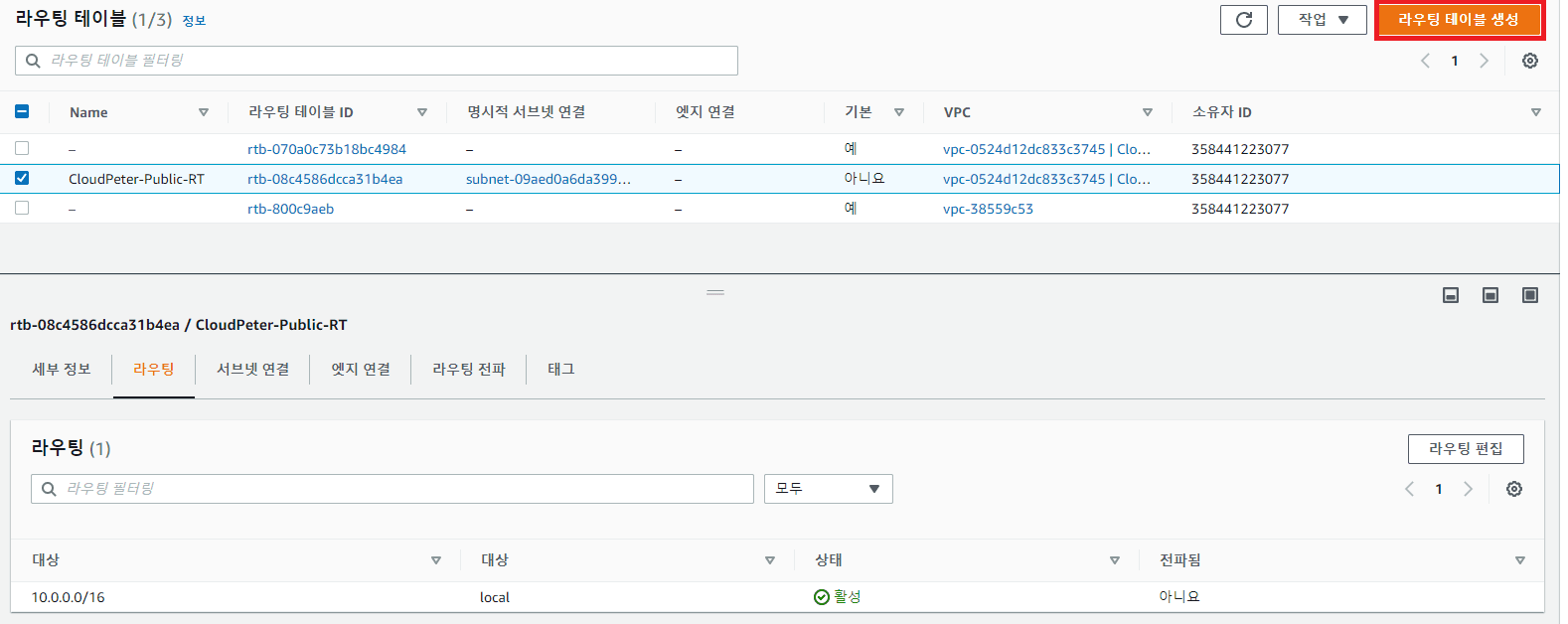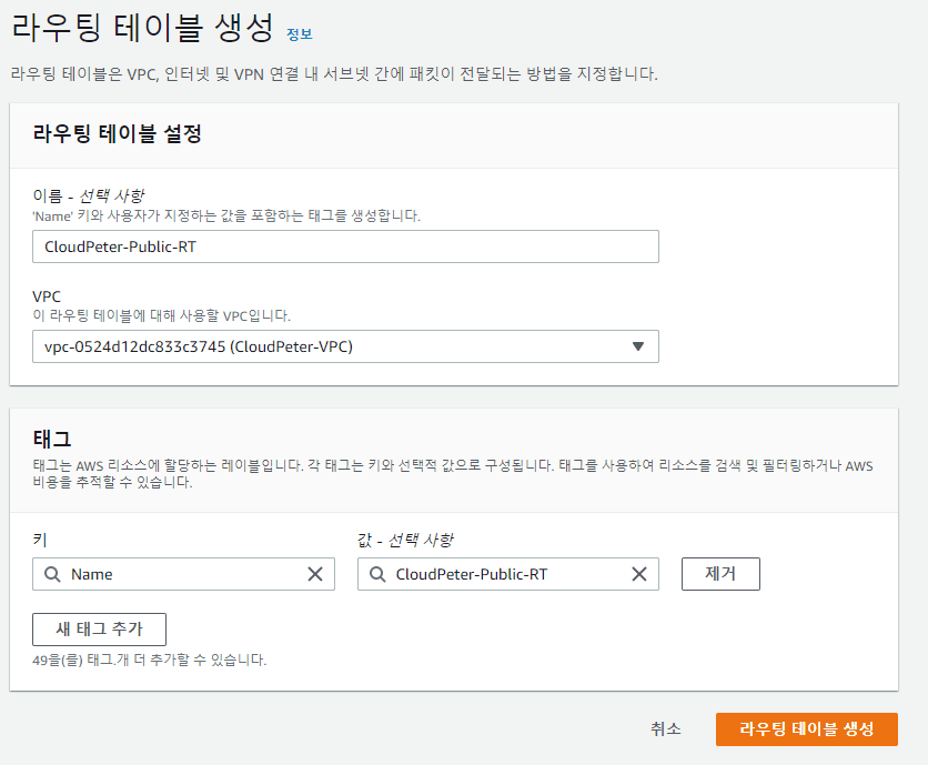 2. 이름 태그: CloudPeter-Public-RT VPC: 생성한 VPC 선택 (CloudPeter-VPC)
