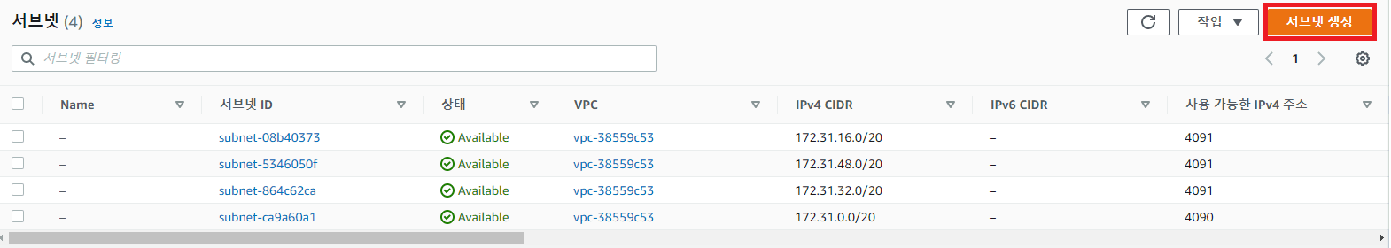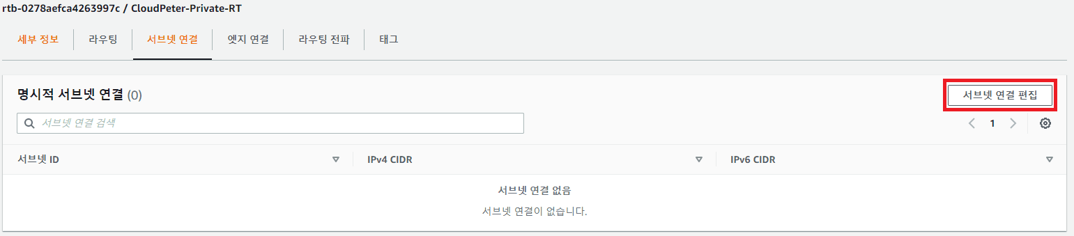 3. 생성 확인 및 서브넷 연결 서브넷 연결 클릭 서브넷 연결 편집 클릭 전에 생성한 서브넷 선택