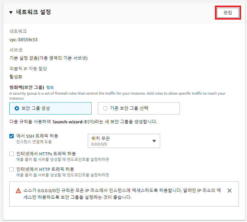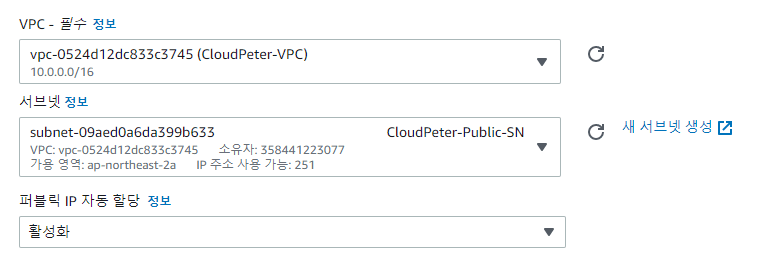 5. VPC: 생성한 VPC 선택 (CloudPeter-VPC) 서브넷: 생성한 Subnet 선택 (CloudPeter-Public-SN) 퍼플릭 IP 자동 할당: 활성화