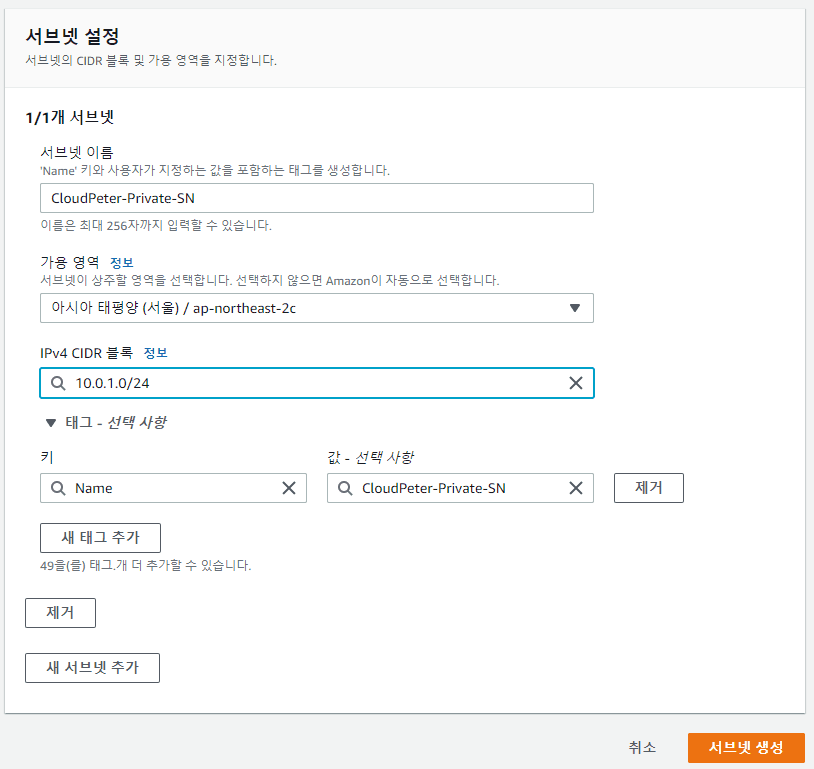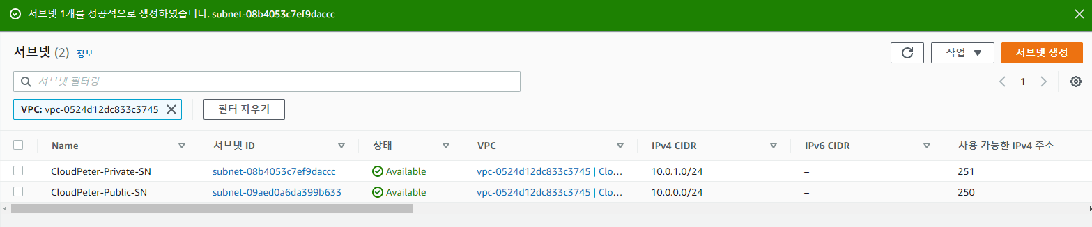 2. 서브넷 생성 VPC ID: 생성한 VPC 선택 (CloudPeter-VPC) 이름 태그: CloudPeter-Private-SN 가용 영역 설정: ap-northeast-2c IPv4 CIDR 블록: 10.0.1.0/24