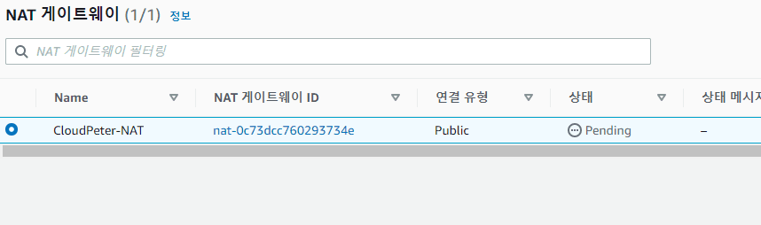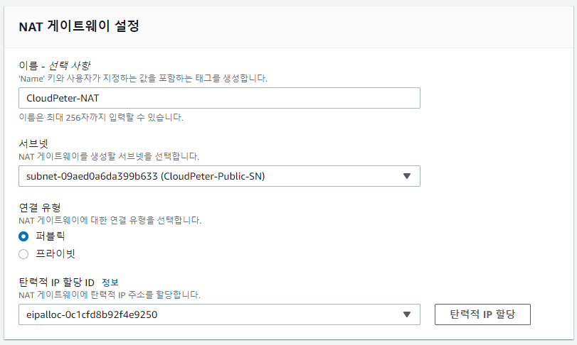 2. 이름: CloudPeter-NAT 서브넷: 퍼플릭 서브넷 선택 (CloudPeter-Public-SN) 탄력적 IP 할당 클릭!