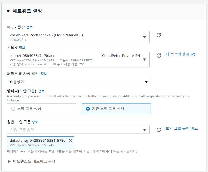 2. 이름: Private-EC2 네트워크: 생성한 VPC 선택 (CloudPeter-VPC) 서브넷: 생성한 프라이빗 서브넷 (CloudPeter-Private-SN)
