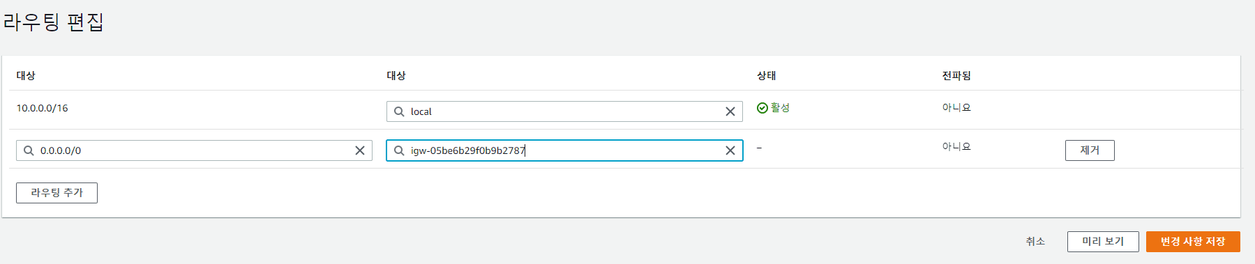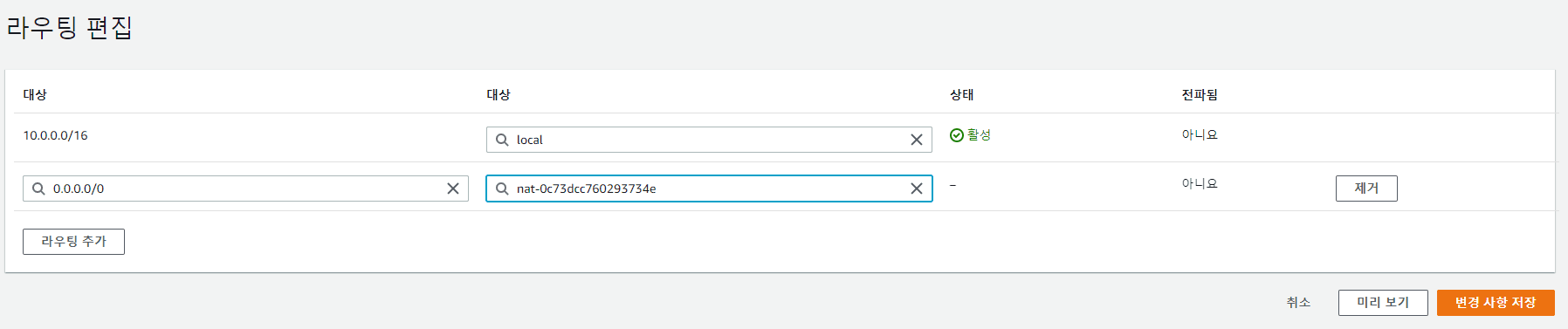 3. 라우팅 편집 클릭 다음과 같이 편집 (NAT 게이트웨이 선택)