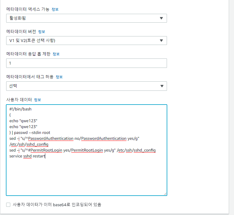위에 사용자 데이터는 암호 방식으로 ssh에 접근할 수 있게 하는 설정이다. EC2 인스턴스가 부팅될 때 읽어서 적용한다.