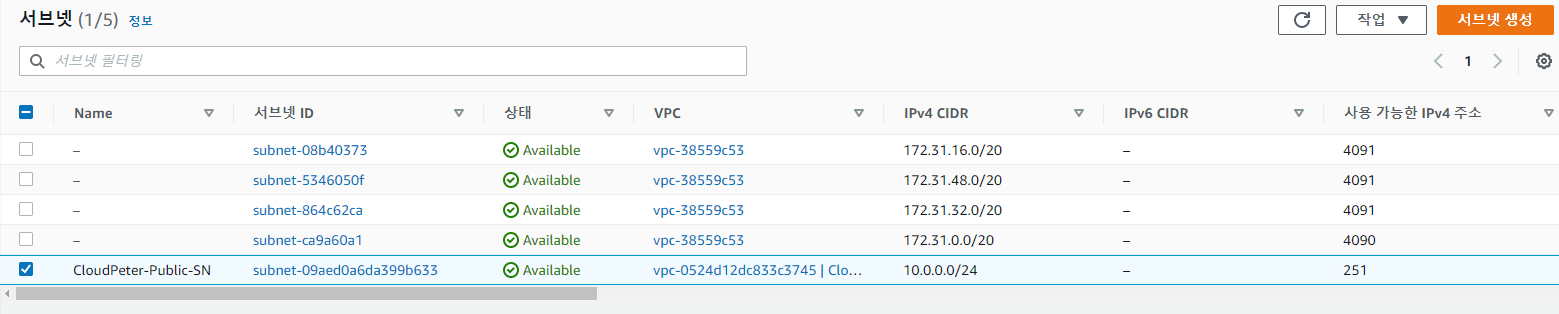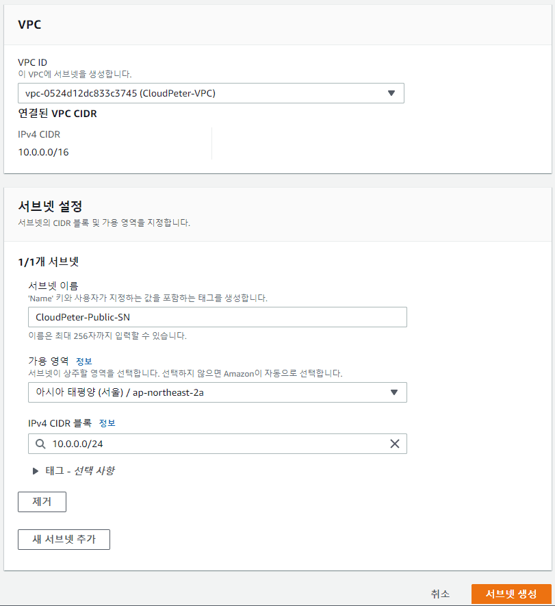 2. VPC ID: 생성한 VPC 선택 (CloudPeter-VPC) 이름 태그: CloudPeter-Public-SN 가용 영역: ap-northeast-2a IPv4 CIDR 블록: 10.0.0.0/24