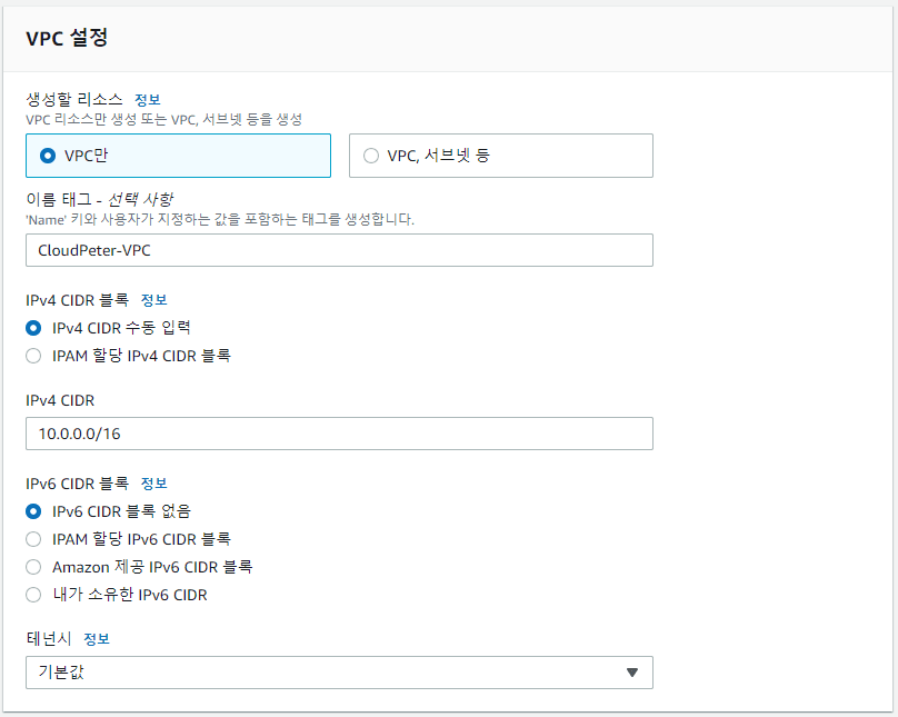 2. 이름: CloudPeter-VPC IPv4 CIDR 블록: 10.0.0.0/16