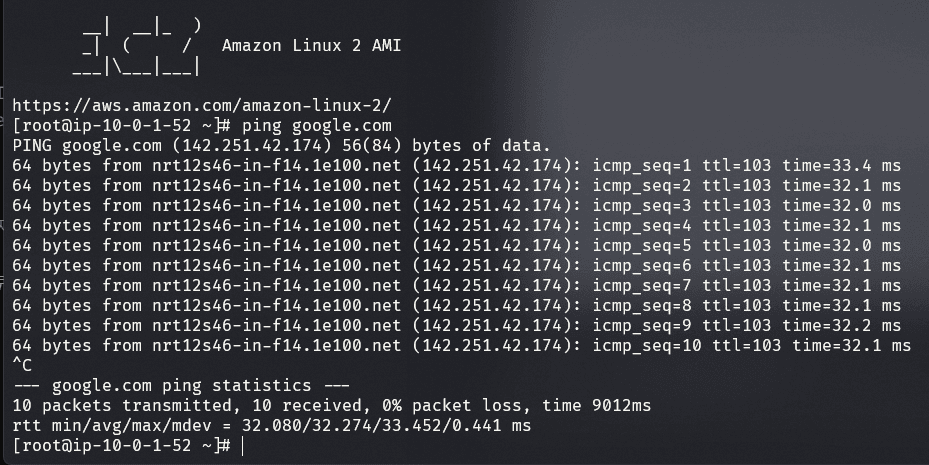 퍼블릭 IP로 SSH 접근 후 ping google.com 만약 핑이 잘 된다면 성공!!
