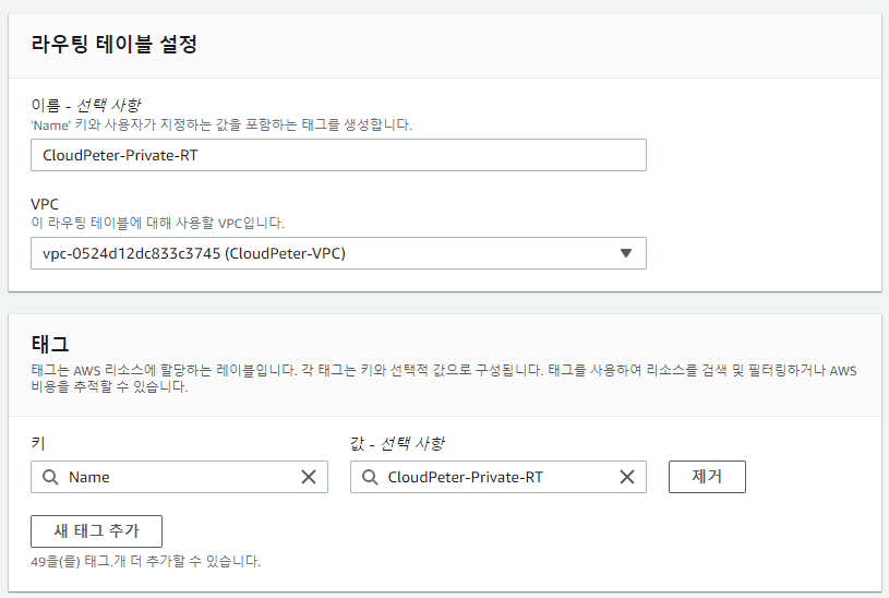 2. 이름 태그: CloudPeter-Private-RT VPC: 생성한 VPC 선택 (CloudPeter-VPC)