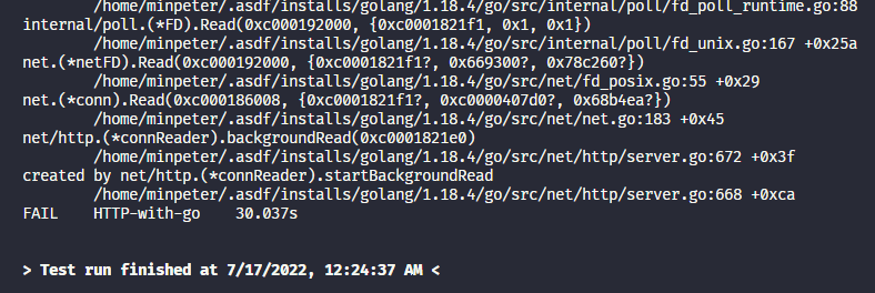 테스트 최대 시간 30초로 설정, 오류와 함께 30초에 종료된걸 볼 수 있다. 책에서는 이걸 Go테스트 러너가 타임아웃되어 테스트를 중단하고 스택 트레이스를 출력했다 고 표현했다.