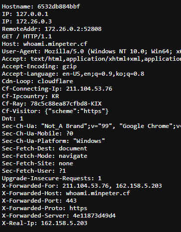 바로 클라우드플레어 프록시 서버의 아이피이고 그 다음 위에선 client ip 였던 RemoteAddr의 경우 클라우드플레어 다음 리버스프록시인 traefik의 아이피이다.
